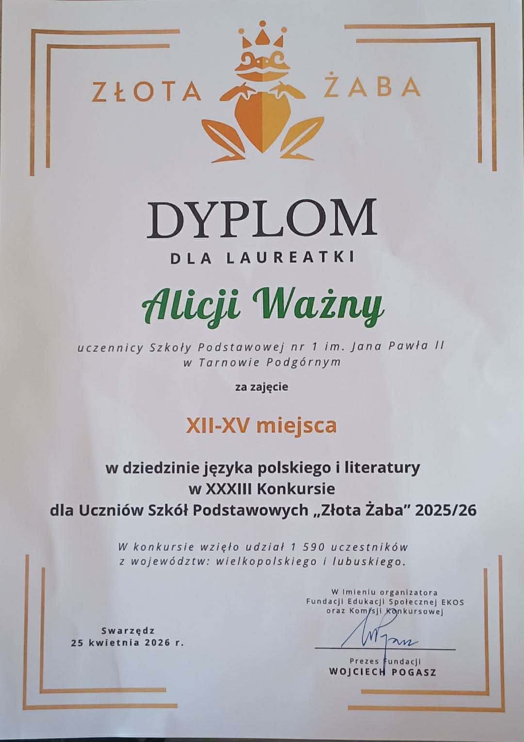 Laureatka oraz uczniowie wyróżnieni w konkursie Złota Żaba to dowód na to, że w naszej szkole nie brakuje młodych ludzi o wyjątkowych zdolnościach i otwartych umysłach. Tegoroczna edycja konkursu przyniosła wiele powodów do dumy - szczególne gratulacje kierujemy do laureatki - Alicji z klasy VIIIc, która wykazała się nie tylko rozległą wiedzą, ale także umiejętnością twórczego i nieszablonowego myślenia.