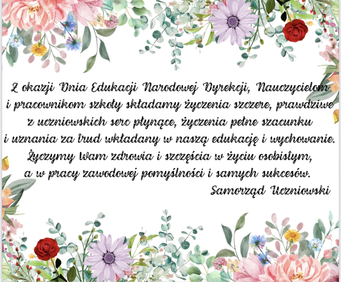 Z okazji Dnia Edukacji Narodowej Dyrekcji, Nauczycielom i pracownikom szkoły składamy życzenia szczere, prawdziwe, z uczniowskich serc płynące, życzenia pełne szacunku i uznania za trud wkładany w naszą edukację i wychowywanie.