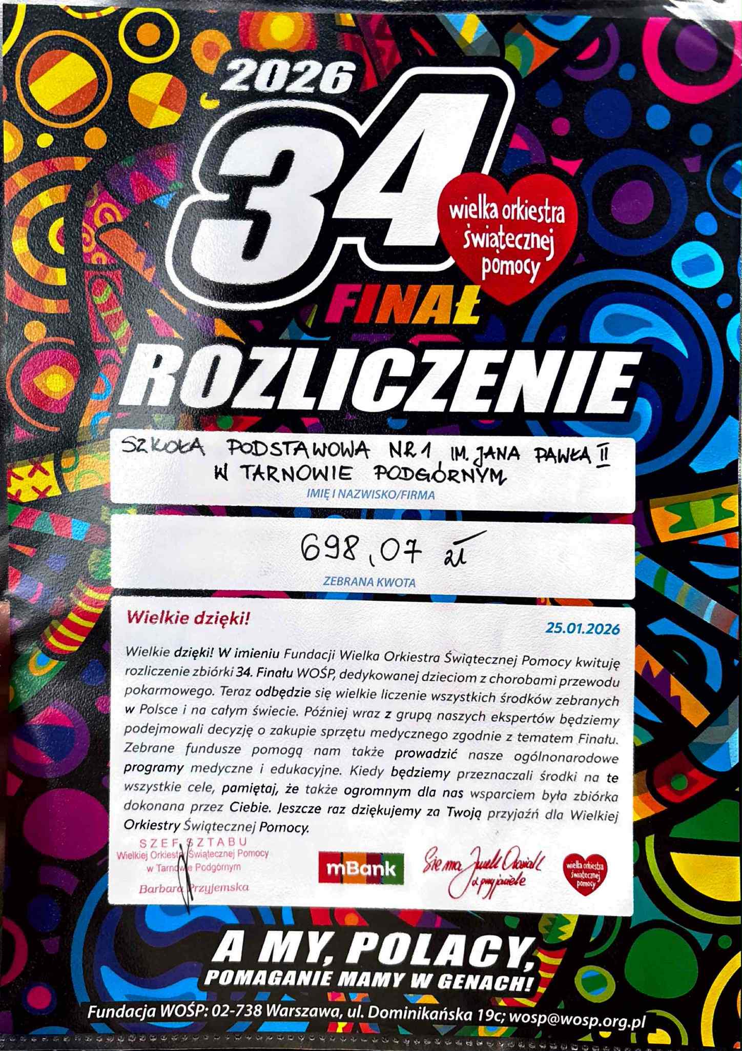 Dziękujemy wszystkim uczniom, nauczycielom, pracownikom szkoły oraz rodzicom za ogromne zaangażowanie w tegoroczną akcję Wielkiej Orkiestry Świątecznej Pomocy. Dzięki wspólnym działaniom, otwartym sercom i energii, którą włożyliśmy w zbiórkę, pokazaliśmy, że razem naprawdę możemy więcej.