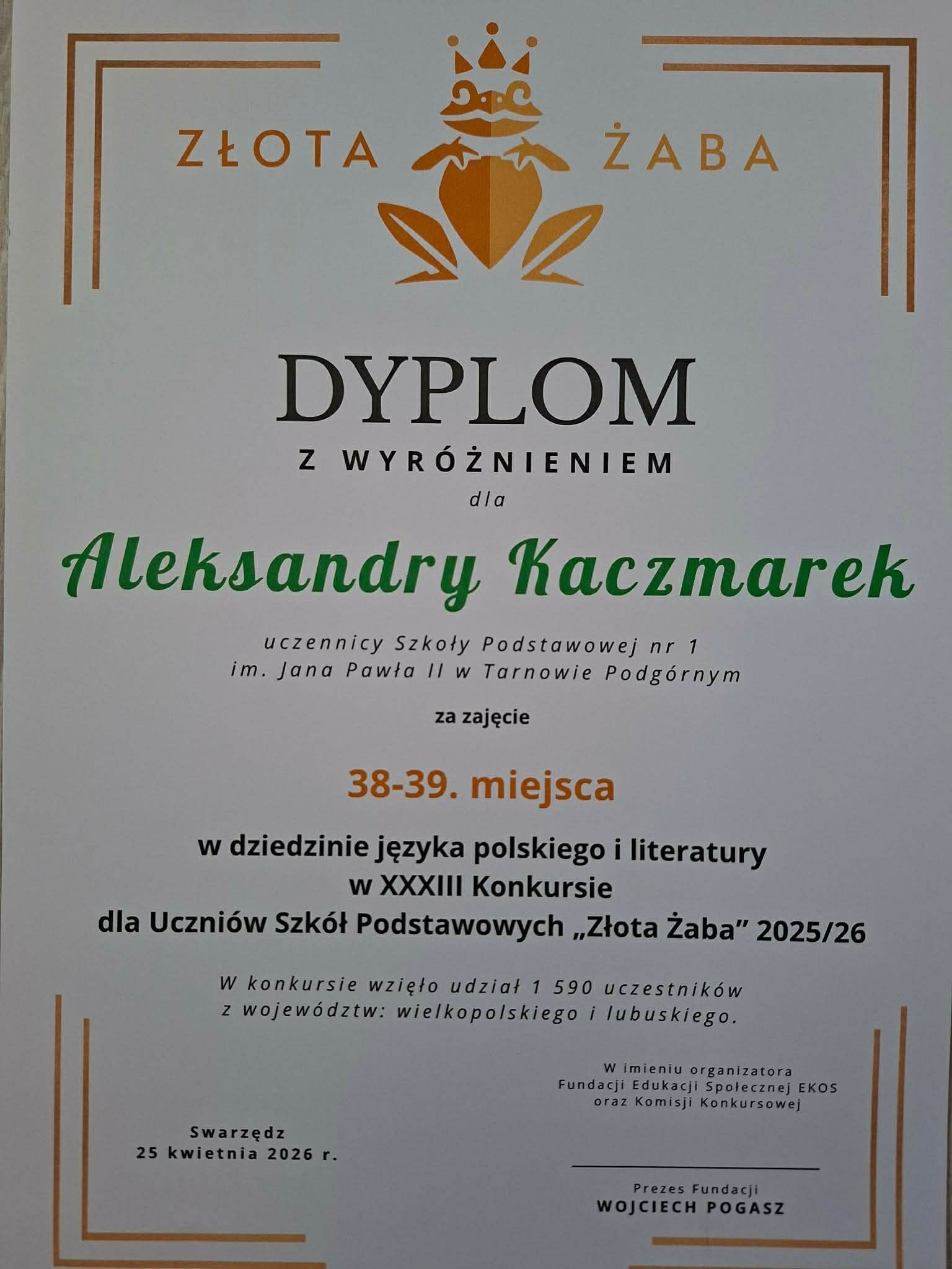 Laureatka oraz uczniowie wyróżnieni w konkursie Złota Żaba to dowód na to, że w naszej szkole nie brakuje młodych ludzi o wyjątkowych zdolnościach i otwartych umysłach. Tegoroczna edycja konkursu przyniosła wiele powodów do dumy - szczególne gratulacje kierujemy do laureatki - Alicji z klasy VIIIc, która wykazała się nie tylko rozległą wiedzą, ale także umiejętnością twórczego i nieszablonowego myślenia.